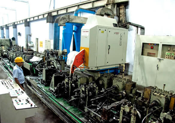 The tube mills installed have a series of forming rolls to anatomise the rolled strips in the tubular form followed by welding. The quick roll changeover not only minimises the production time but also contributes a lot to the overall capacity. The mills make use of variable high frequency induction welding technology offering the finest quality welding strength to the tubes with no material used as filler. The offline Eddy Current Tester further ensures the weld quality by inspecting the tube for any flaws.